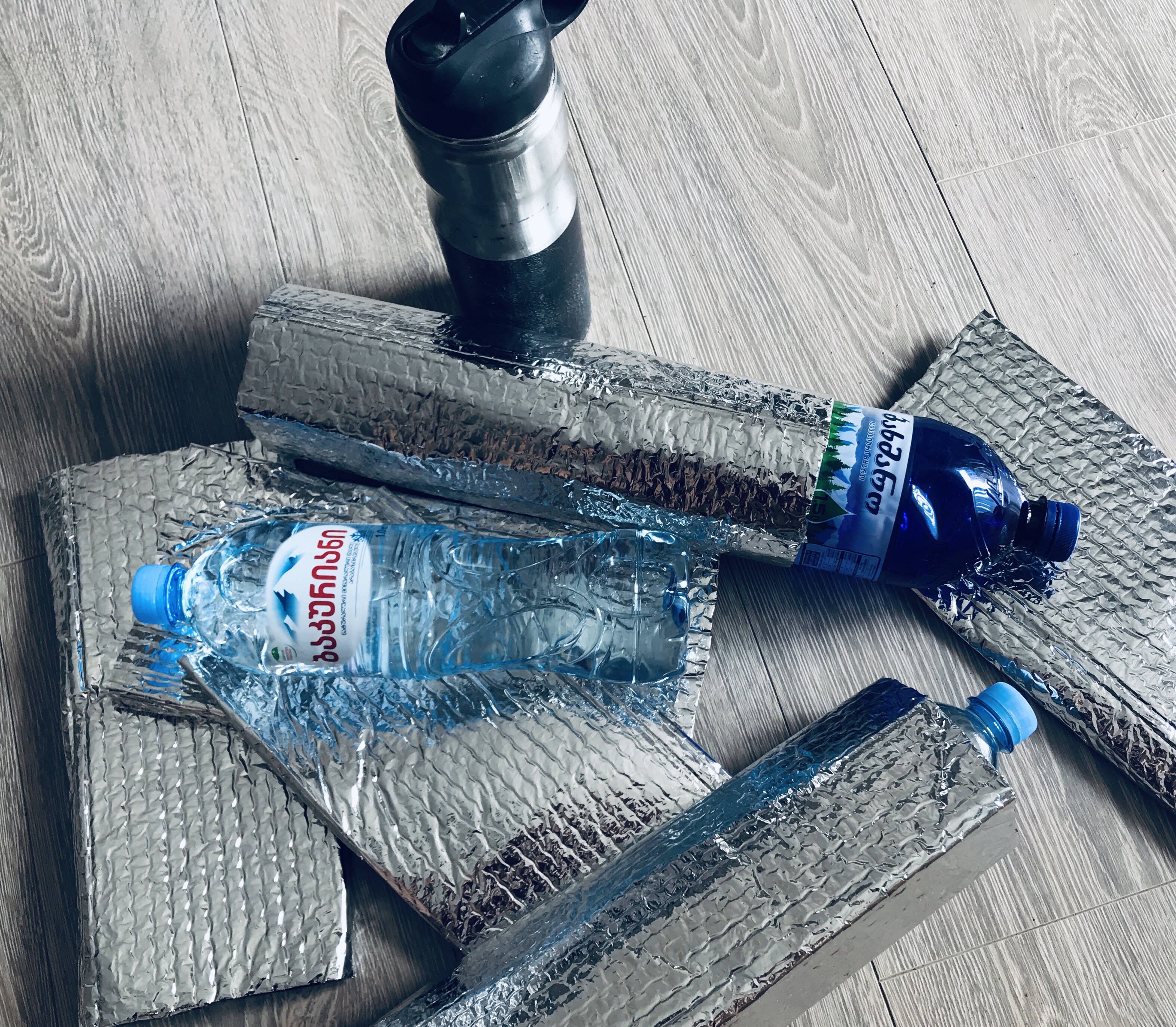 Cycling through the desert of Kazakhstan and Uzbekistan, temperatures will be in excess of 50 degrees, at least 20 litres of water is required on a daily basis, keeping it from reaching almost boiling point is always difficult, we already carry insulated bike bottles, but from past experience we always make some foil sleeves from car windscreen shades for the extra bottles of water we carry, it does make a difference..