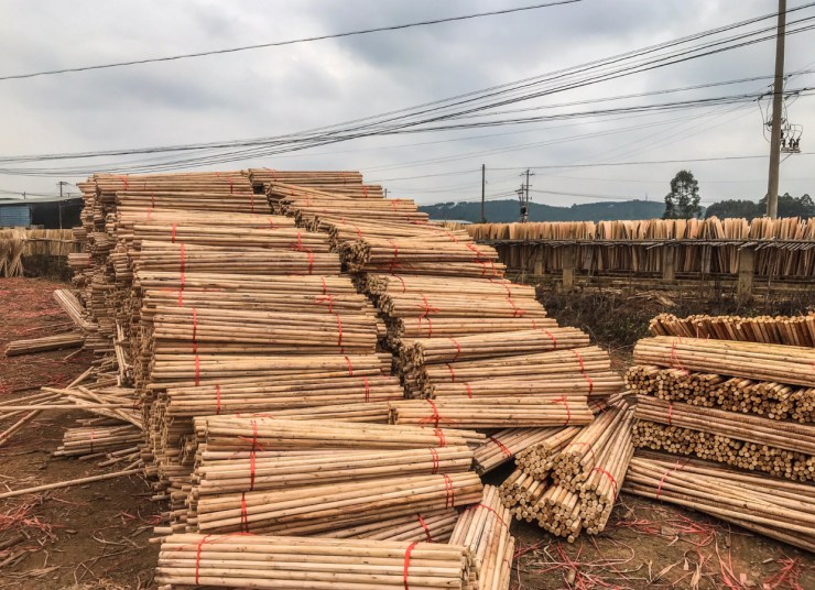 Tai Sunโs job is to collect the circular broom handles from the saw mill where he loads them up by hand onto his scooter truck, he then delivers them to Mei Ling, she then bundles about 40 of the broom handles together by tying string round the center, then with a sudden twist of her hands she makes them into a fan shape and stands them up to dry out in the heat.