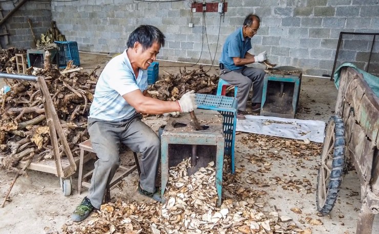 Earlier in the week we ran out of water so stopped at the side of the road to filter water from a small stream, there was no one around us, it almost looked like we were cycling through the jungle, but then suddenly, much to our surprise!! a lady appeared from out of the tall bamboo grass, dressed all in black wearing a black hat and face mask, we thought she was a ninja! she spoke little English but we understood what she was trying to say, she was asking if we needed help! so she invited us back to her house, which was just the other side of the bamboo! as we made our way through the bamboo grass and down a narrow lane we could see her house, it was enormous! she gave us food and water and we were introduced to her family. She lived on a huge farm, and owned all of the land around as far as the eye could see, to the rear of her house was a factory where she manufactured Chinese herbal medicine, the family supply all the ingredients to Taiwan where itโs then shipped all over the world. It was so interesting to see the whole process. Hereโs a few pictures of our friend Lou and some of her staff, she did let us film but weโre unable to post films whilst in China as the internet is very limited to foreigners and most social media including google and YouTube are blocked, we can just about manage to make this post by sending it through a VPN app which isnโt always great, but anyway what an amazing experience, and she made the best herbal tea!