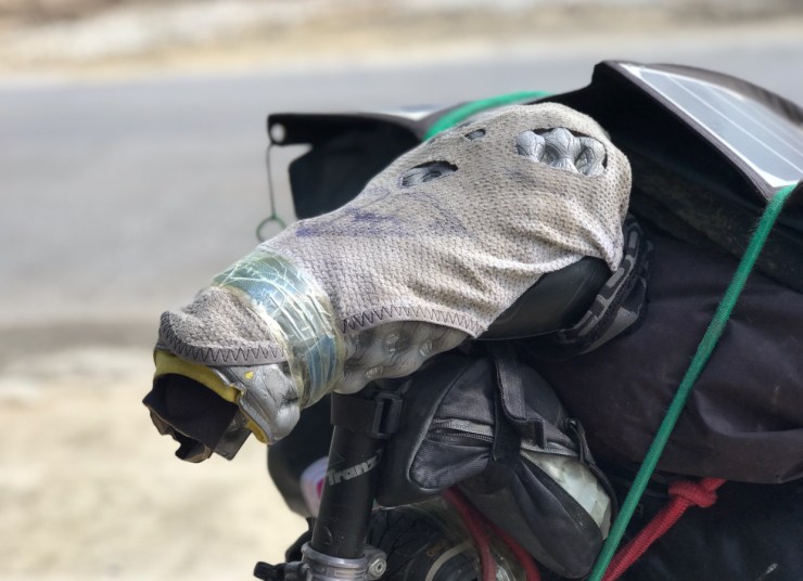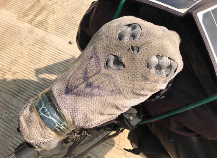 For many years I’ve always worn padded Lycra cycling shorts, which aren’t always the cheapest, just to make things clear, it’s when I’m cycling, I don’t wear them all the time! The problem I’ve found with Lycra shorts is that they are too clingy and don’t always allow those hidden parts to breath, this causes a problem known as chafing, which for those of you that don’t know, it’s when you firstly gain a heat rash, shortly followed by a burning sensation until the saddle completely removes your skin from those sensitive parts! We tend to spend on average about 8 hours in the saddle each day, so experiencing chafing is a regular occurrence especially in the severe heat of the desert. Over the years I’ve spent a fortune on expensive padded shorts and even replaced my saddle many times. Here’s the interesting bit, several months ago when I was cycling through the desert in Kazakhstan I was experiencing terrible chafing, let’s just say the skin had gone! so I decided to cut up my 2 pairs of Lycra shorts and clad my saddle with them, and wore just a normal pair of lightweight shorts, oh yes, and it’s important not to wear underwear! since then