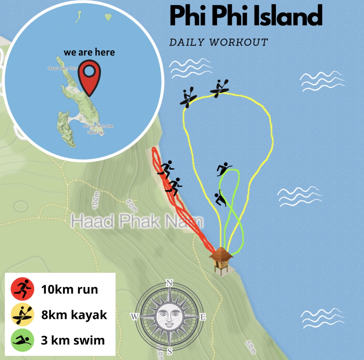 We start our mornings with an early 10km run as it’s low tide at sunrise so there’s plenty of room on the beach, after that we take the kayak out and do an 8km loop (a local kindly lent us his kayak) it’s hard paddling out as we are against the tide, but coming back in, is easy as we paddle with the tide, we then finish with a 3km swim once the tide is fully in, this helps for stretching off and cooling down, after that I go looking for food and water, whilst Gabs does a body combat workout, she’s just mental 🤣