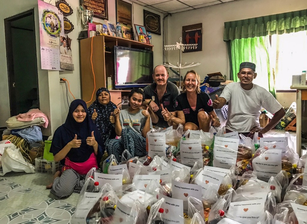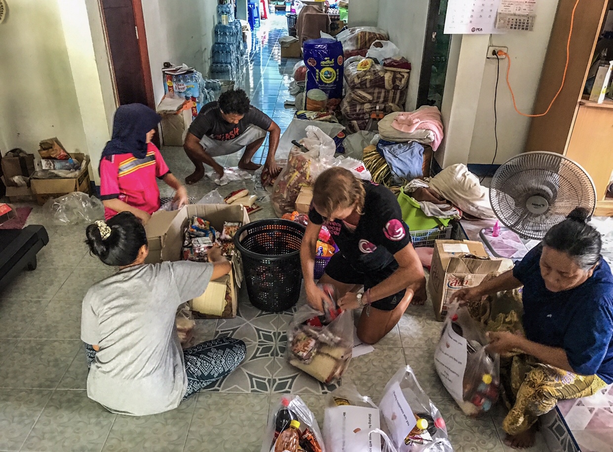 Hereโs our good friends helping us to prepare the next batch of family food parcels, ready to be delivered around the island tomorrow, they will be delivered by long tail boat to the families living on the shores, and motorbike to the families living in the jungle.