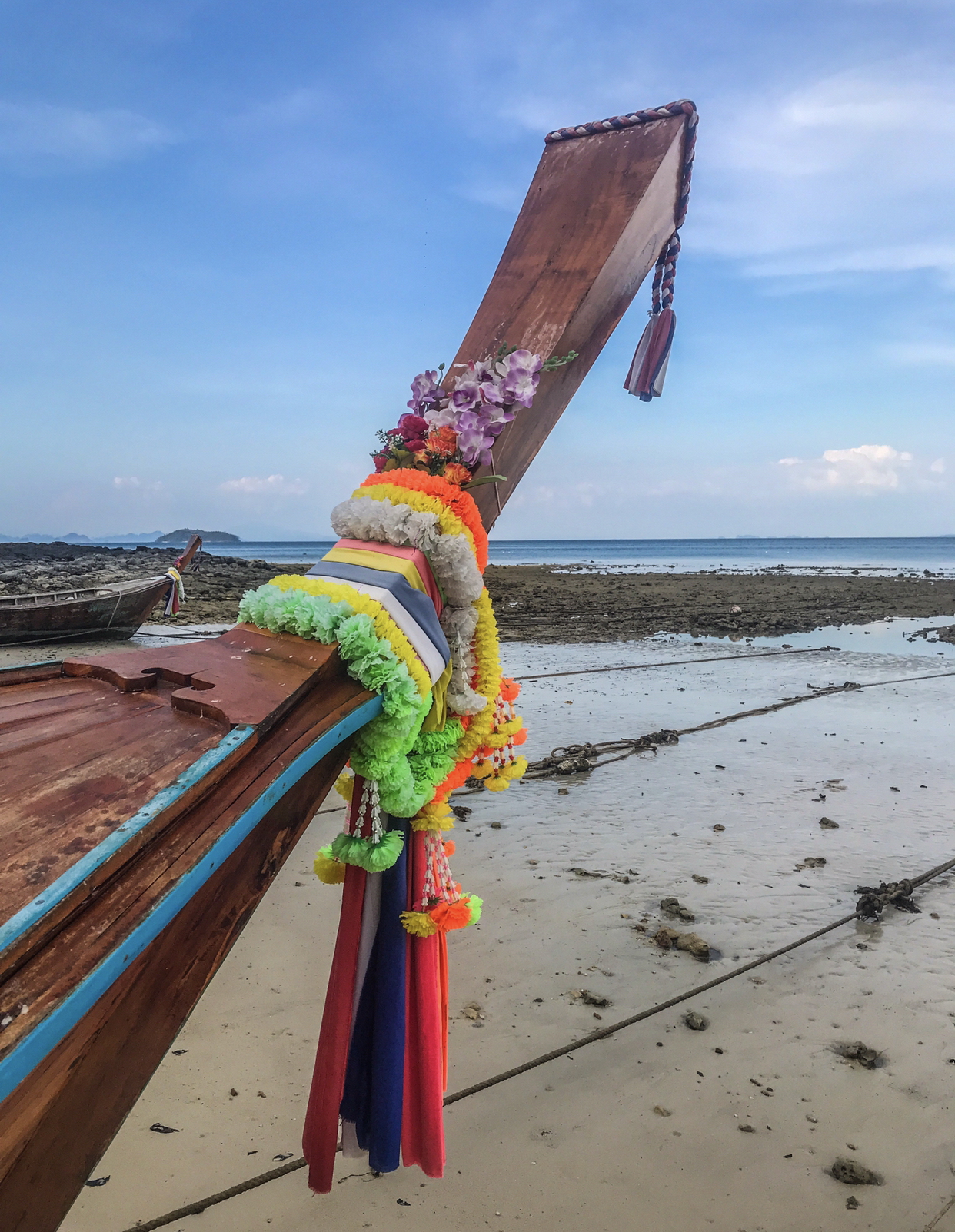 It is believed that every tree has a guardian spirit, who when the tree is cut down and built into a longtail, stays and lives in the body of the boat to protect it. This Guardian spiritual goddess of boats is called “Mae Ya Nang”, or the ‘Grandmother of Boats’, by many thai fishermen. The decorative sashes and flowers are gifts, intended to pay respect to, and honour the water spirits and Mae Ya Nang who then grants her protection, ensures safe passage, a propitious career, and a bountiful catch of fish.