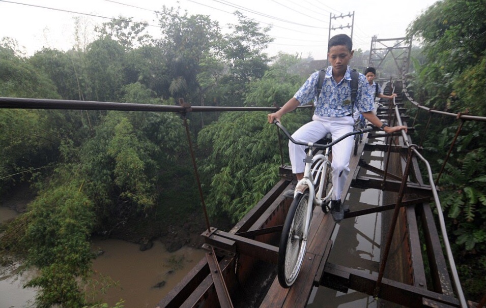 These are the amazing scenes as a group of Indonesian children take a death-defying route to school each day on a 100-foot-long suspension bridge, while riding bicycles on narrow wooden slats.