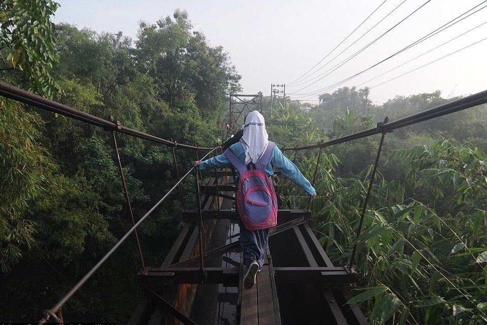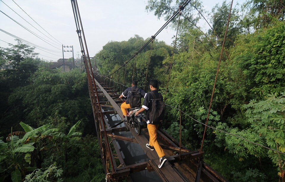 The youngsters travel along the bridge which is held up by steel cables through a jungle in Java.
