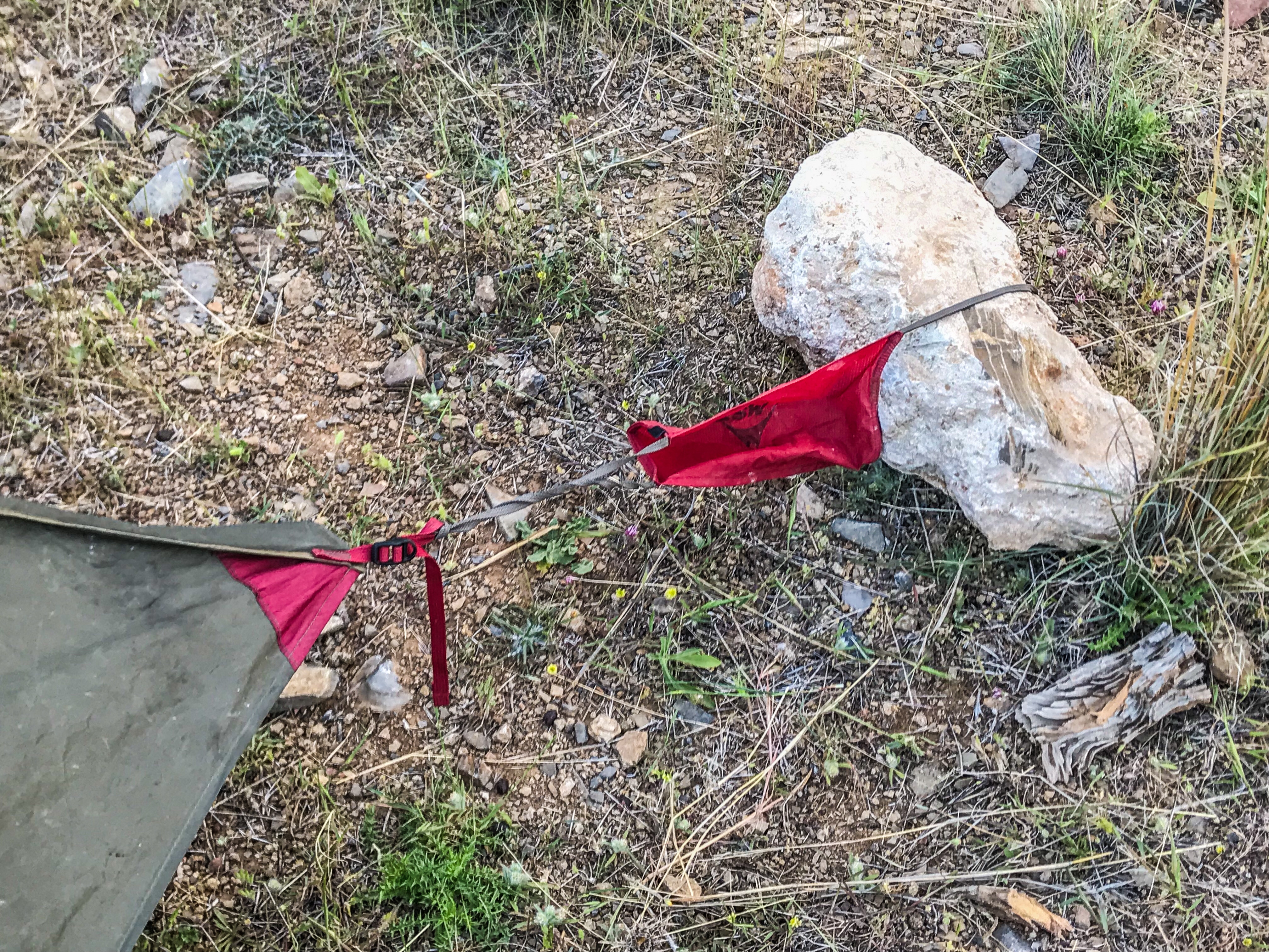 A few years ago we added some ‘deadman ground anchors’ which are used to secure the tent to the ground, for example sand, when in the desert or on a beach, you dig a hole in the sand and bury the fabric anchors, as you can’t use traditional tent pegs, they are also great for like where we are now in the mountains, the ground here is solid rock, so we find various sizes of rocks to anchor the tent down, very important when in windy conditions like we are now.